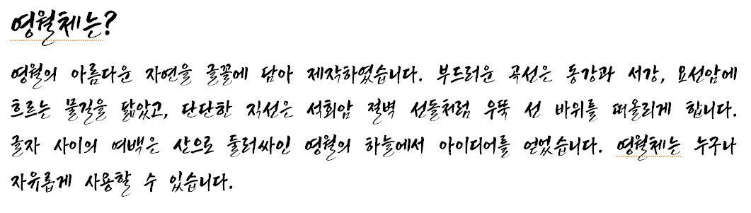 영월은 두 번이나 근무해서 아주 정이 많이 가는 도시다. 우연히 영월체를 알게 되어 내려받아 보았다. '눈누'를 찾아보니 웹폰트로도 만들어져 있다.
