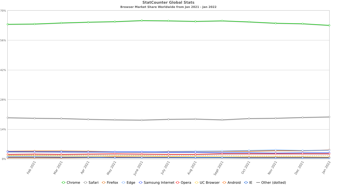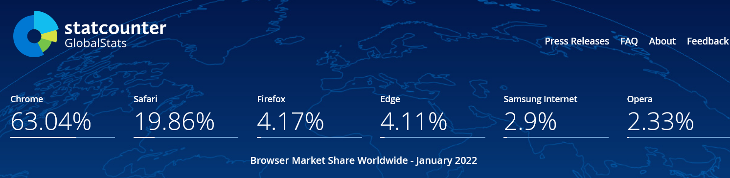 갑자기 궁금해서 브라우저 점유율을 확인해 본다. 브라우저 전쟁은 끝난 것일까? 마이크로소프트(MS)의 인터넷 익스플로러(IE) 천하를 끝장낸 크롬의 기세는 여전하다. 에지는 생각보다 저조하고 사파리는 의외로 상당하다. 모바일 기기 사용 비중이 그 가운데 애플 제품이 차지하는 비중이 만만히 않음을 알 수 있다.