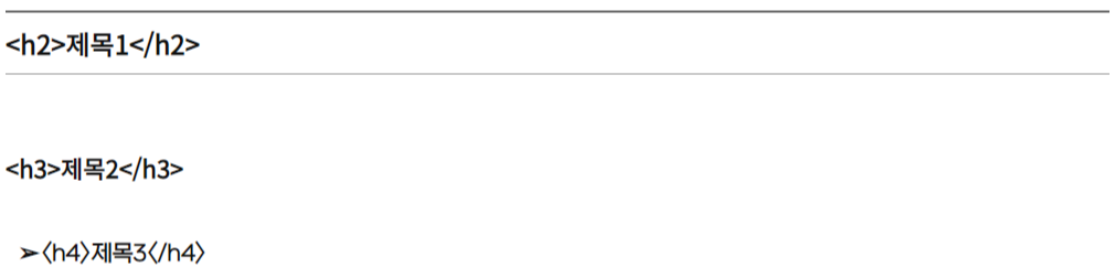 조심할 점은 티스토리 스킨은 대부분 글 제목에 <h1></h1>을 이미 배정되어 있어서 제목 1은 <h2></h2>, 제목 2는 <h3></h3>을 달아 준다. 스킨에 이미 h 태그에 꾸미기를 해둔 대로 나온다. 이렇게 글 안에 작은 제목을 구별해 두면 검색 로봇이 글을 더 잘 파악할 수 있어서 검색이 잘 되게 만들 수 있다고 한다.