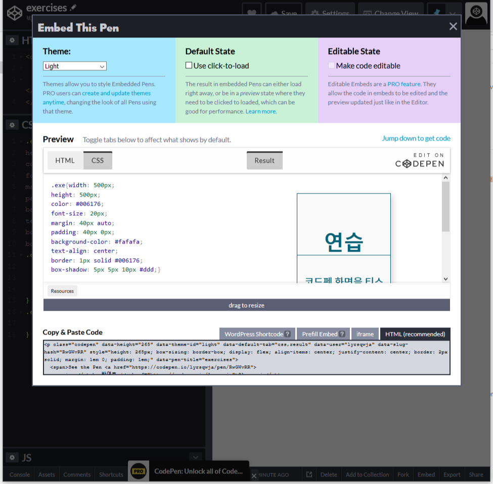 인터넷으로 불가능한 일은 없다. 시에스에스를 공부하다가 코드펜을 알았다. 에이치티엠엘, 시에스에스, 자바스크립트를 실행해 볼 수 있는 사이트이다. 공부에 큰 도움이 된다. 여러 블로그에 코드펜 화면이 그대로 옮겨져 있음을 확인하고 방법을 찾아보았다. 생각대로 아주 잘 정리해 놓은 글이 있다.
